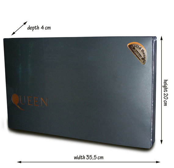 The wood box has laser engraved images on both front and back outside surface. On the inside of the front cover, two frames contain the original inlay booklets; on the inside of the back, the frames are modeled to contain the original US 3 CD release. The numbered metal plate will be screwed on the front cover, in the upper right corner. The number will be punched in by hand. This box is covered by a cardboard slipcase; the color may vary.